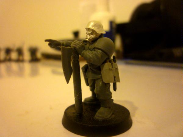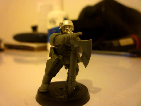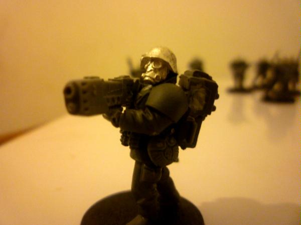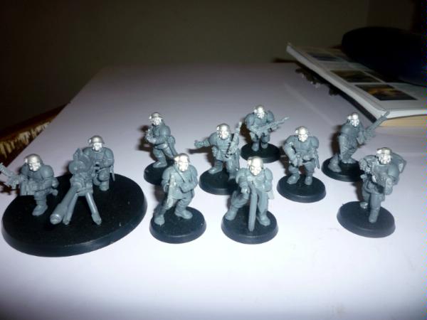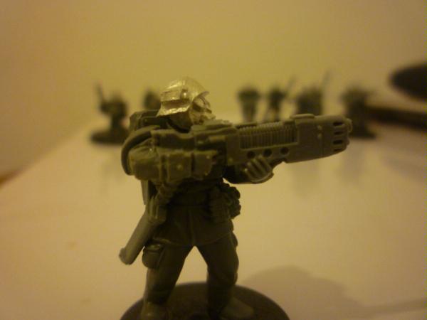 Here's my new project, hopefully the start of an imperial guard army. I've used pig iron gasmask heads, and replaced the cadian lasguns with autoguns from the forgeworld renegade weapons set. (because lasers that work like rifles don't make any sense, and because the autoguns look cool). The only difficult bits about this were unwarping the resin rifles, and getting the forearms and hands to fit right - I wanted to keep the bulky, uniform cadian shoulders, so I have to slice cadian arms and