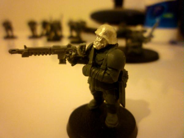 Here's a rifleman who turned out well: One autogun had a broken-off stock, so I glued the remains on upside-down and had the model firing it one-handed. Looks a bit like some mobile model of the usual rifle. I really like the bandaged arm bit from the cadian command box - instantly transforms any soldier into a badass, on account of he's still fighting one-handed.