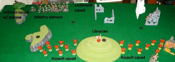 I put my two assault squads and librarian spread out along the halfway mark of the table. I figure if I huddle near the middle, I can adjust to where he deploys and be in assault during turn two. He countered with an infantry platoon, a veteran squad in a chimera, and his command squad. They huddled near the long table edge and off center to my left.