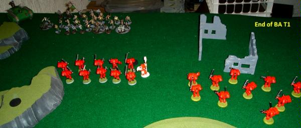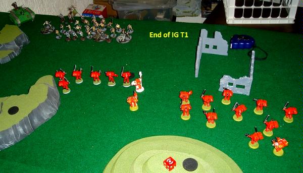 The game began and I got the chance to draw first blood. I moved both of my assault squads 12 inches towards his infantry platoon. The librarian joined the left squad in the process. Several bolt pistol shots later resulted in four dead traitorous guardsmen.