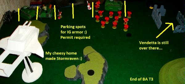 His reserves continued to arrive, slowly... He got Marbo, a heavy weapons team, the second devil dog, and the colossus. The picture I took at the end of his turn was so bad it is worthless to post. Allow me to describe the action as well as I can. The colossus moved on six inches in the far right corner of the board. It was in a safe position to rain fire on me the rest of the game. The second devil dog moved on approximately 30 inches away from my reduced assault squad with libby. The heavy weapons team moved onto the board and embarked onto the vendetta. The libby activated the shield one more time. The veterans in the corner, opened up on the stormraven. It was saved by a 4+ flat out cover save. Marbo, the devil dog, vendetta, and colossus kill several of the formerly full assault squad.