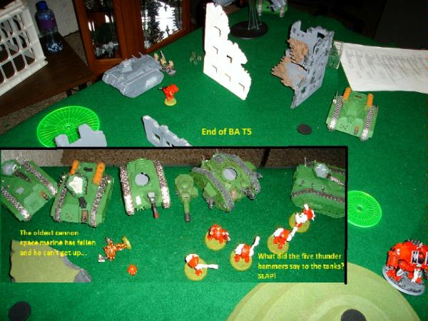 SS termies, one assault marine with a meltagun, a dread libby, and Dante remaining. He had a platoon command squad in a chimera, a heavy weapons team in a vendetta, a devil dog, two leman russ tanks, and a colossus.