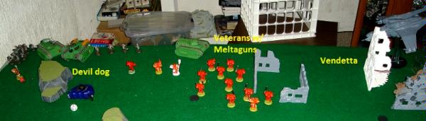 The remaining three platoon command squad members move out from behind the destroyed chimera and leveled their meltaguns on veteran marine Ace "melta to the face" Solo. The vendetta moved onto the nearest objective and the heavy weapons team disembarked. Ace lived up to his nickname. The immobilized devil dog destroyed my libby dread. I forgot to activate the shield power.