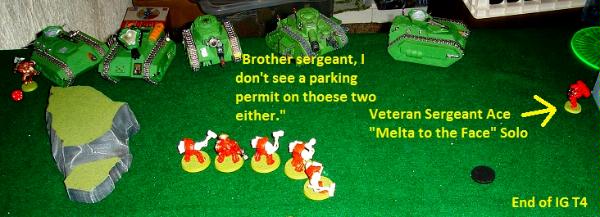 Draw, draw, draw, how can I pull out a draw. He just has too much mobility remaining. It has been a very fun, close game to this point. Let's see what happens... Plan: The termies will assault the two leman russ tanks. Move the dread and hope for a good blood lance roll on the remaining devil dog. Dante will start to move towards the remaining guard. I make another debatable play mistake. I move my remaining assault marine towards the platoon command squad in the chimera with the aim of destroying the chimera with the meltagun. This is a debatable mistake because I could have tried to hide my last remaining scoring unit. At the time I thought it was better to go out with a bang as opposed to hoping for my opponent to miss / make a mistake. Opinions? Actual: Dante moved. The termies destroyed the two battle tanks. The solo marine with a meltagun destroyed the platoon command chimera. All five guardsmen inside were wounded, but my opponent made three of the five 5+ t-shirt saves.