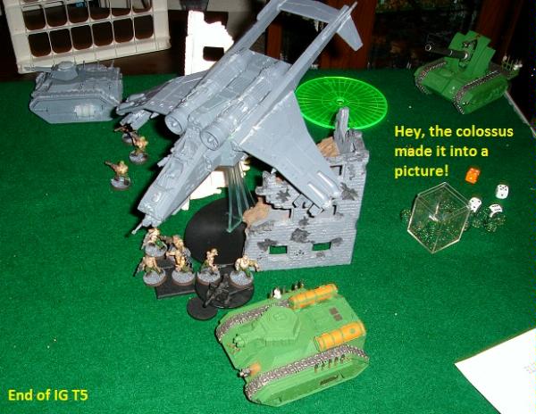 The platoon command squad moved closer to the objective with the heavy weapons team. The heavy weapons team embarked on the vendetta and the vendetta moved towards a second objective. The colossus rained more fire down on Dante, he made the save this time. I rolled a six for an additional turn.