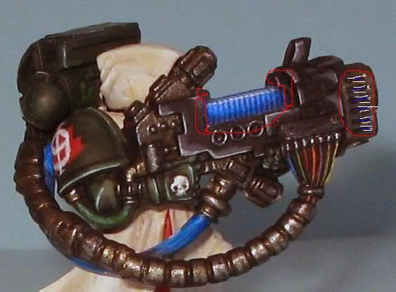 I was going to do scorpion green and white for the plasma coils I just wanted it to look like it was casting that color on to my marine also here's a start of what I want to accomplish  the red area's i have circled are where the green light will be over spilling so to say and the blue and white I inserted into the maw of the plasma gun I figured would have been painted already but alas their not so im going to paint that area myself