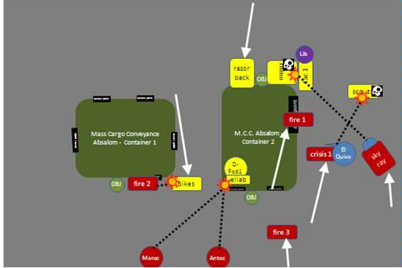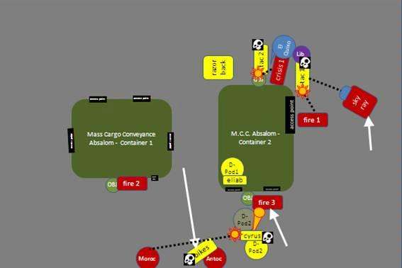 As the sun Dragons had 2 drop pods, the first dreadnought made an early appearance. Now in our warm up games, the drop pods had hardly ever scattered significantly. However this time the pod scattered its max distance into the container! The fire warriors still got toasted by dreadnought Eliabs’ heavy flamer but were largely intact because of the scatter. Moroc and Antoch stunned and immobilized the dread in the following turn. The scouts and crisis team traded blows from long range, with the sky ray offering markerlight support.
