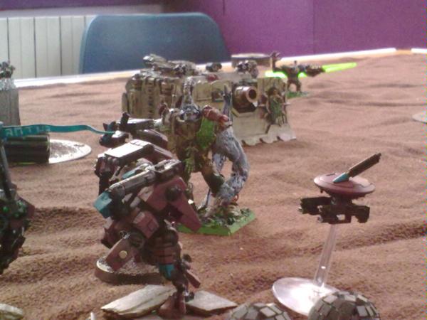 Well, I’m guessing you think the Guard were due some luck in this game. That’s pretty much what I thought too. But it went from bad to worse as you can see below (apologies for showing the skyray moving – it was immobilized by then!). Basically all Tau units advanced on objectives or guard units. The fire warriors gunned down the heavy weapon troopers with rapid fire. El Quixo left the crisis team and finished off a guard unit. The crisis suits were quite literally relentless, and wiped another squad out, the ratlings trying in vain to stop them. They just would not fail any armour saves! The peripheral action saw the hellhound turret blown off and the Leman Russ destroyed by the broadsides, who performed well in this game. I’m pretty sure the crisis team fled near the end of the game due to heavy lasgun fire, but it was in vain as the Tau commanded the key objectives!