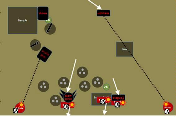 After the destruction of the transport, the next priority was to get rid of the daemon prince. Being a Tau, the scariest thing on the table is a mobile CC monster. He had to be taken down, and so all Tau fire was focused on him. Dispite several wounds caused, he emerged still living, psychic energy emanating from him! He channeled this energy by using warptime and assaulting the suits, annihilating them. The vindicator and obliterators blew up the skyray, while the plague marines continued to advance on the fire warrior objective.