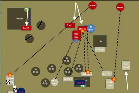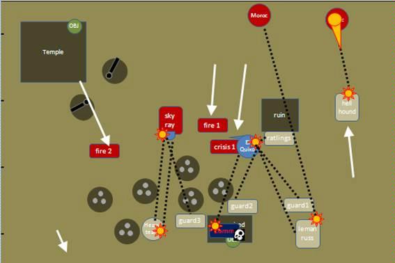 Hmm well it seemed clear that my right flank was fine after all, so the second fire warrior unit ran out of the temple toward the guard lines. The skyray advanced under heavy fire from the guard heavy weapons teams, and was immobilized. The crisis team again took huge amounts of lasgun fire and pretty much walked through it (T2 style). When the guard fire ceased, El’Quixo spotted the commisars command squad and directed the crisis fire toward them. Again fortune favoured the Tau. As well as inflicting 7 wounds, the command squad failed every single cover save (no I’m not joking!). The guard just seemed to be doomed!
