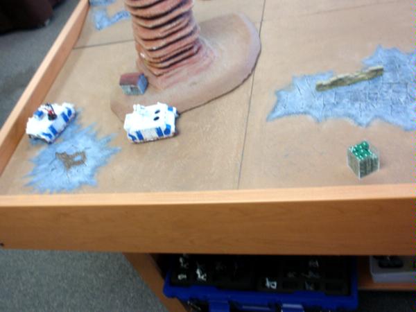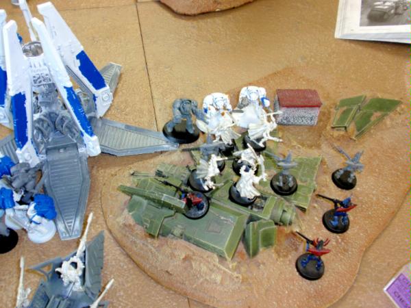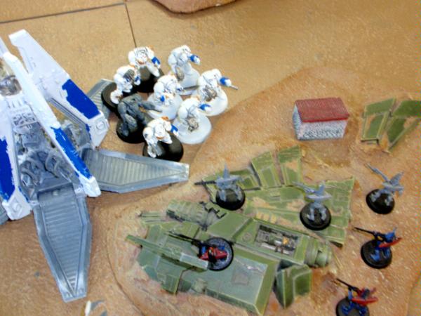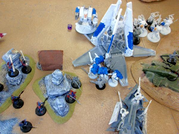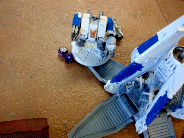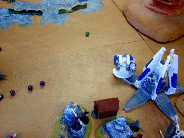 the Ironclad Dread comes in, Kills 3 warriors, who break and fall an amazing 12 " back, and next turn fail their morale and get off the table.. Failures. The newly disembarked marines from the Razorback run behind cover, all his missiles miss, to his dismay.
