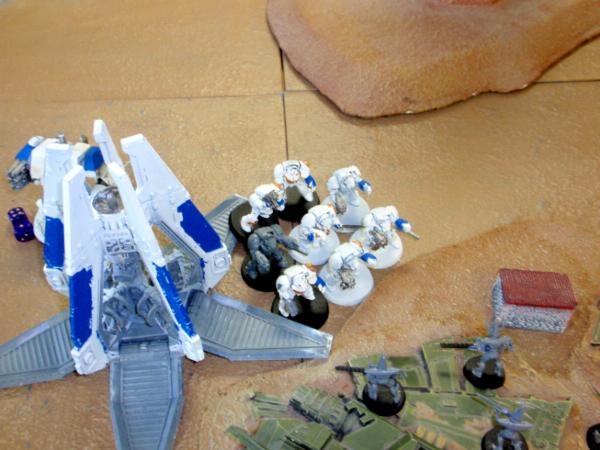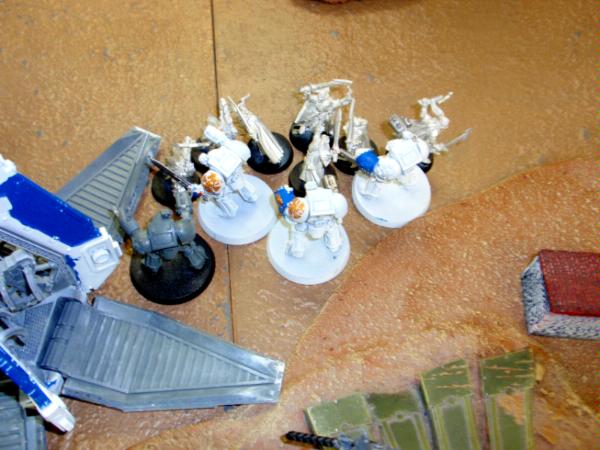 The assault marines and his remaining drop pod come in from reserves. The assault marines deploy within 6" of the drop pod, to the left this time, while the sternguard and sicarius drop right behind the Archon's raider... The assault marines shoot up 3 of the