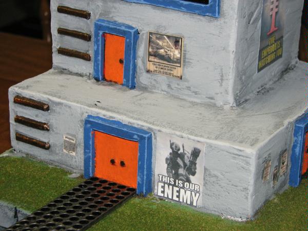 This is an example of both techniques - please ignore the crudeness of the other stuff, it's one of my first pieces. It does show you the texture though. The building got the drywall compound treatment, the ground got the sand treatment (although with the flock over it, it's a bit tougher to see).