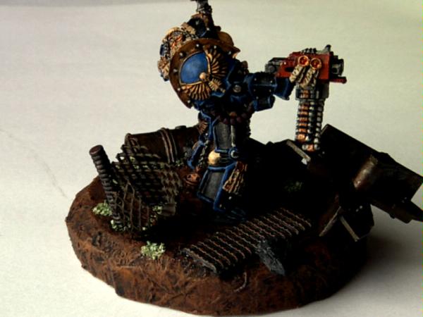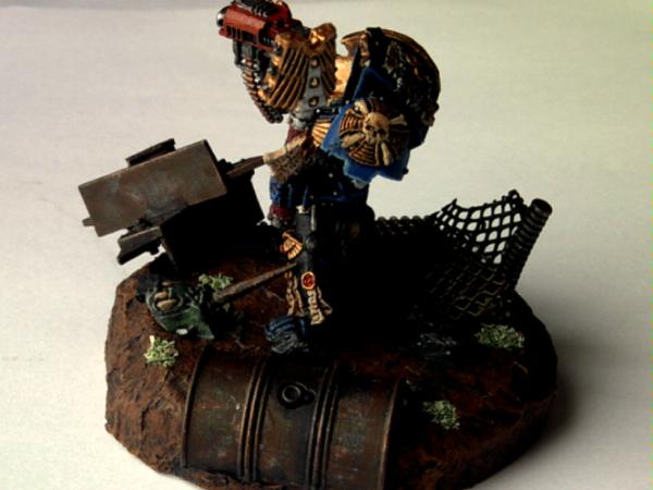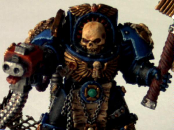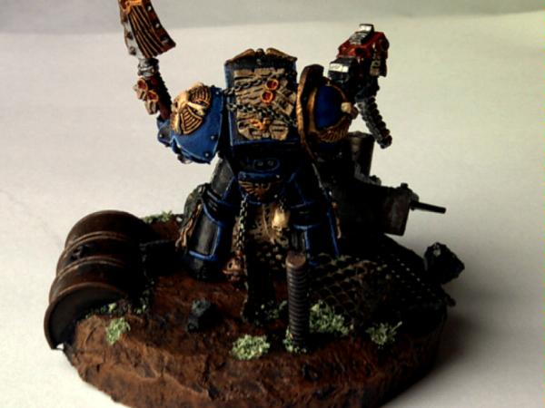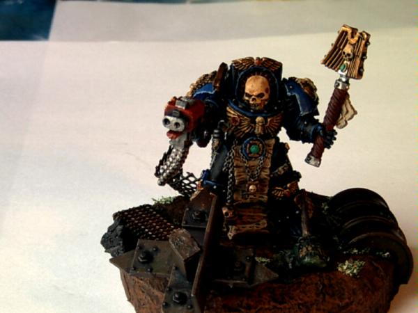 i'd recommend that the chaplain get out of the junkyard! he could get tetanus!  nice job on the base and the model. i especially like the blue trim on the terminator armor bracing (like the back of the legs). the only thing i'd recommend is maybe making the scroll work a bit lighter although the darkness could simply be because of a lack of flash on the pics.