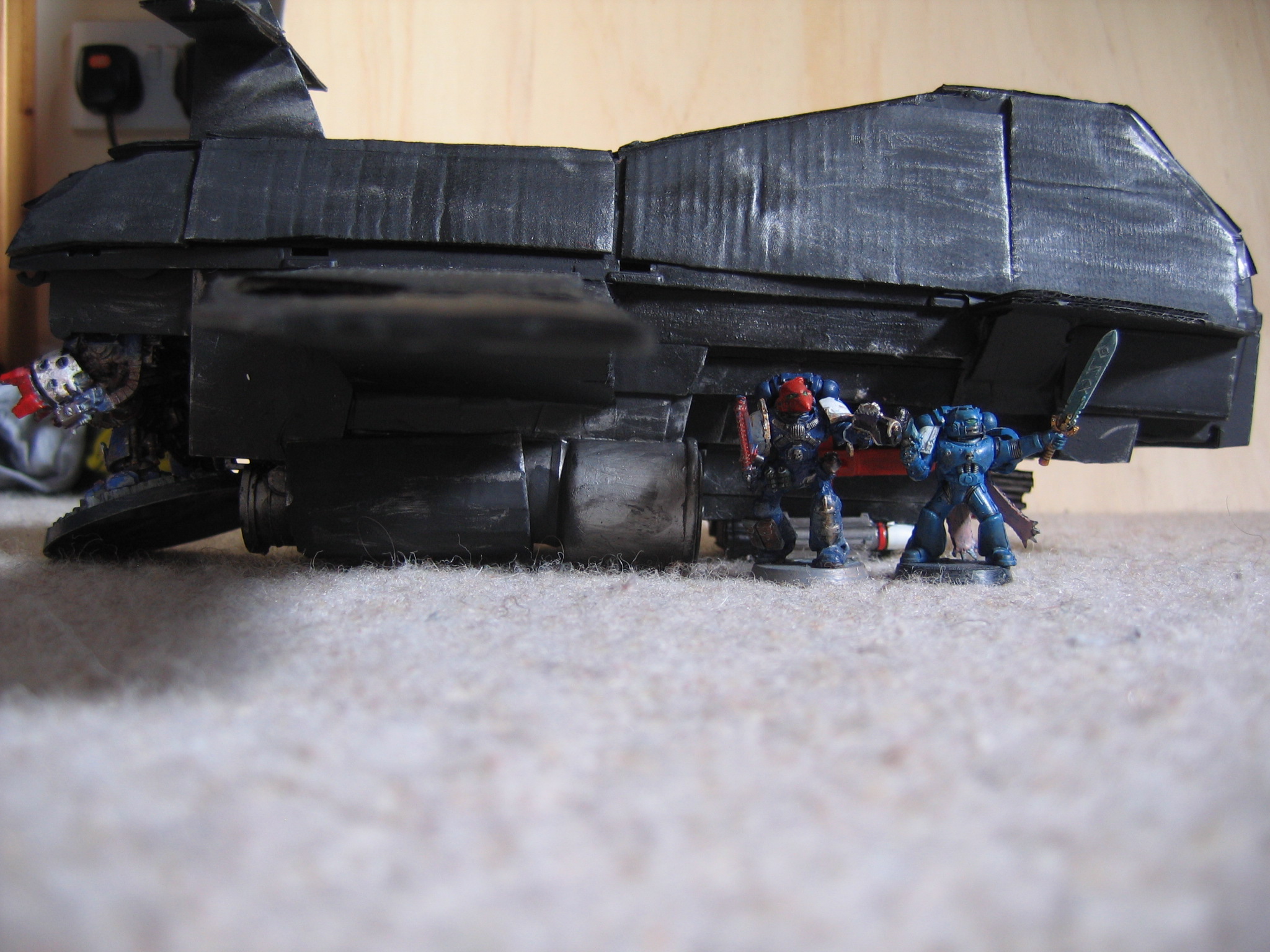 This however is a fair bit larger than those of other attempts, this is because I wanted to make it look like it could carry its specified cargo, unlike most GW APCs (even "True Scale" marines). Well here it is, it was made from an old toy ferry (main body), paint pots, glue, cello-tape and a whole lot of card board. (meaning it may be a bit weak and "droopy", the downside of cardboard) I may go over it and give it some more detail and properly do the interior. (if possible) No GW parts were used in its making. Comments would be appreciated.