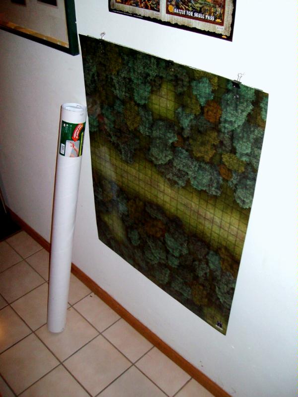 When I need to transport them to a game outside of my home base, I roll them into a 3" dia x 36" cardboard mailing tube, but roll the side you want to use on the outside. Then you can lay it flat and blue-