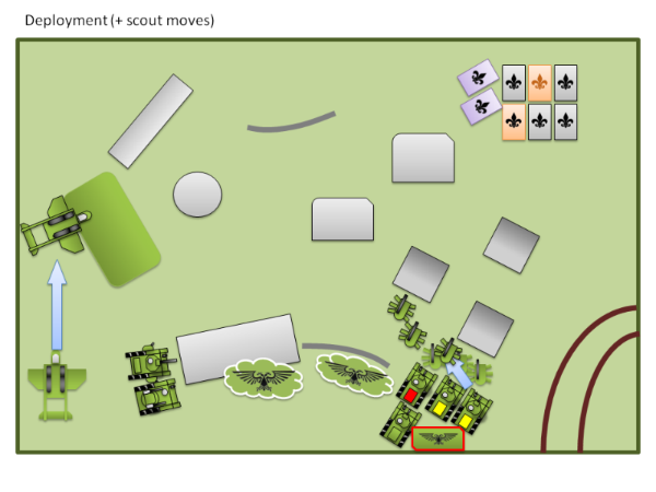 Rolling up a mission and deployment gave us Annihilation of the Pitched Battle persuasion. The Sisters won the roll off and decided to go first in order to bring their toasty makers that much closer to my melt in your mouth vehicles and tinder dry infantry. Both sides deployed their full forces (kinda negating the use of my Astropath, but what the hey) and the Guard made their Scout moves as follows: