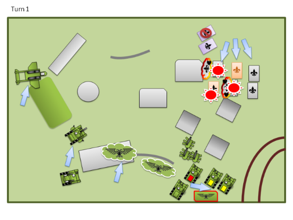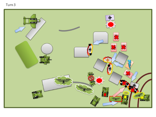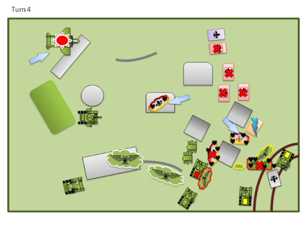 The Guard lines continue to make small adjustments to their positions but no major movements. Let the witches come! Some sniping manages to whittle down the visible foot troops a bit, but the big result is the popping of the covering rhino and immobilising and