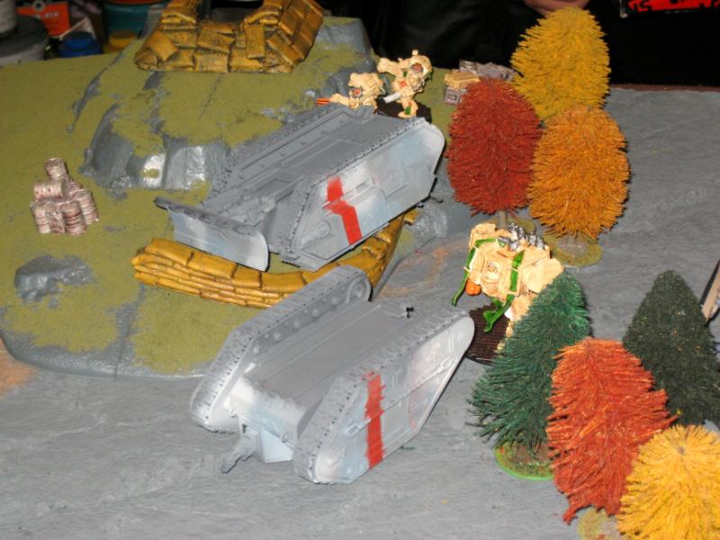 The lone assault cannon terminator shoots the executioner (no damage) and then assaults it, ripping off the main gun. The multi-melta dread shoots the punisher and misses, charges it and rips off the main gun. The fortress terminators shoot down whats left of the blob. The assault terminators finally manage to blow up the vet chimera, and they have to emergency disembark.