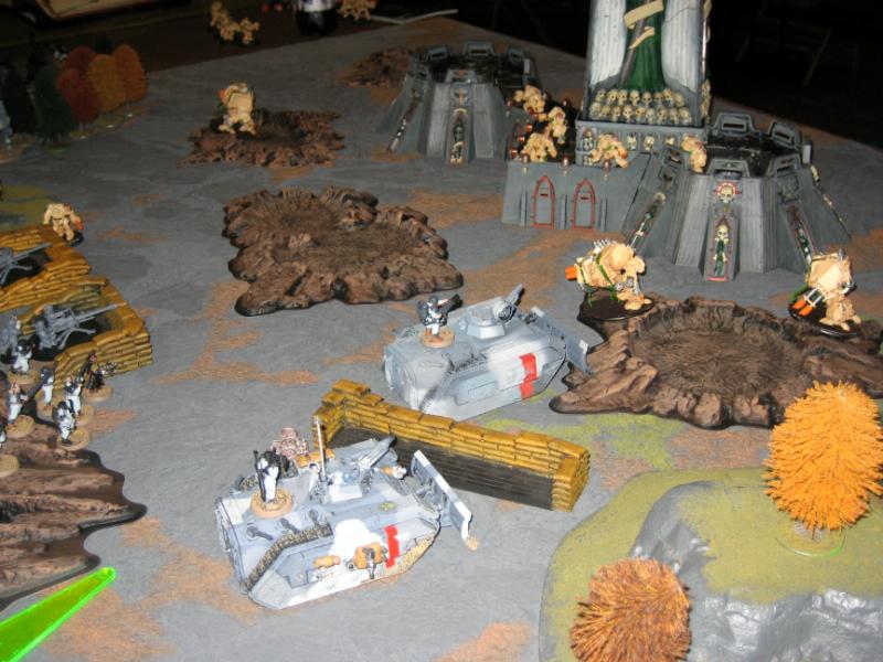 No reserves. The terminators move up on the command squad and infantry squad. I do some flaming and kill about 6 guardsmen. Both squads roll double 2's for their difficult terrain checks in the assault phase so I'm unable to link up the command squad and blob squad in the same combat. I kill off the command squad, but the two terminators only kill 2 guardsmen from the blob. I shoot a chimera with a mutli-melta and roll a 1 and a2, the lascannon shoots for a sentinnel, rolls a 2, the shooty terminator squad shoots into the side of the chimera and doesn't penetrate. The far multi-melta dreadnaught hit's and destroyers a sentinnel.