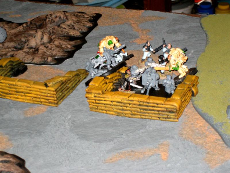 The battlefield. So to try something a bit different. We rolled the mission type and deployment type before setting up the battlefield. This was so that we could make the table a little more thematic. I would get the fortress of redemption and I brought a sand bag trench line for the guard to use (I had set up the game the previous week so I could match the rest of the terrain to my opponent. For asthetic reason's I liked the line of craters between the guard lines and the fortress of redemption however it didn't leave a lot of protection for tanks and walkers. So all walker's or tanks were allowed to "dig in" on the craters. Basically they had to make a difficult terrain test and then they would be counted as being obscured as they dug the vehicles into the freshly created craters. We rolled pitched battle, so I handed the sand bag emplacements and told my opponent to place them anywhere he liked on his side. I then placed the fortress in the middle straddling the 12" line. We decided to play the fortress as a single bunker.