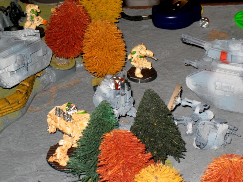 Thoughts: Okay I'm going to deepstrike in with both lightning claw squads, going for the right side of the table, I can run and spread out to guarantee he can only get one hit per terminator with the plasma cannons, and because of the tree's and his own guy's I should be able to get cover saves from everything. I'll move the dreadnaughts up and hopefully start popping chimera's and the sentinnels.