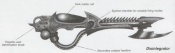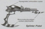 The Splinter Pistol is the ranged weapon of choice for most the remainder of the Dark Eldar forces, finding frequent use in the ranks of Archons and Dracons, Wyches, Mandrakes, and most Sybarites. Usually paired with a Monomolecular Knife or Claw and used as a pair for added effectiveness in assaults. The Splinter Pistol uses the same ammunition and firing mechanisms as the rifle, although compacted and therefore less powerful, and with a smaller ammunition crystal to reduce the weight even further. Splinter Pistol crystals are therefore the most frequently impregnated with toxins, as they are the weapons that need the added effect most.