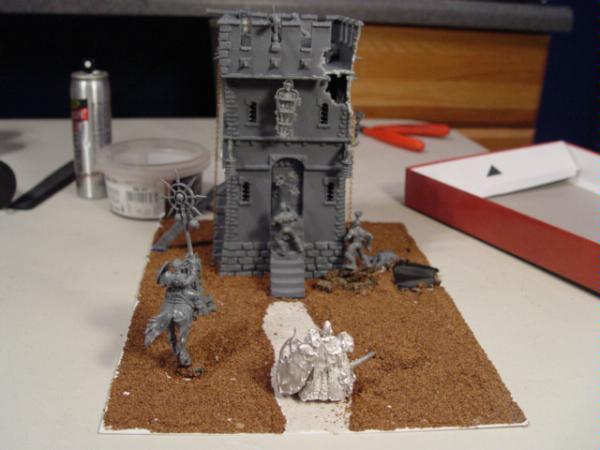 Mine is basically an empire watchtower that is being raided by marauder warband being led by non other than Wulfric. Sinse the idea is that Empire would try to hold the tower from the top, Ive decided to have the marauders climbing the sides of the building via hooks and chains (that I got from my FW Warmamoth! Never thought Id find a use for them!), while one of them trys to bash down the door with a flail. So take a look at the pictures and tell me what you think! Any ideas or thoughts would be greatly appreciated, as I still got a week to build it (competition is on the 31st).