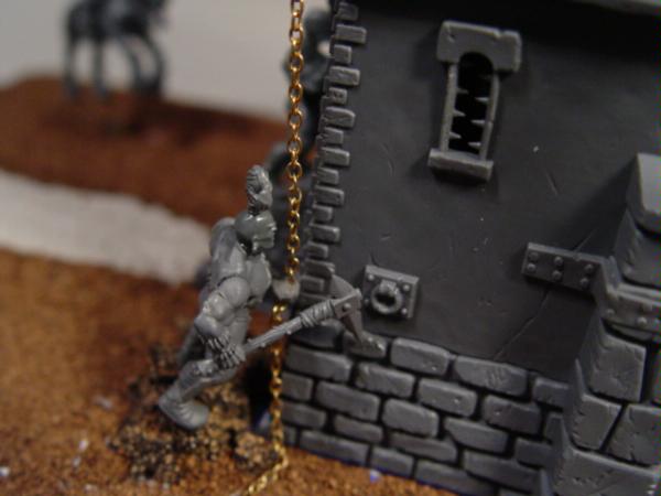 I like how you braced the climber's feet on that little ledge, as well. I don't believe that GW makes any appropriate models sculpted mid-climb, so getting a natural pose isn't easy. Your positioning helps make his ascent a bit more believable, even if you can't get the pose exactly where you'd want it. It's all in the details, it seems.