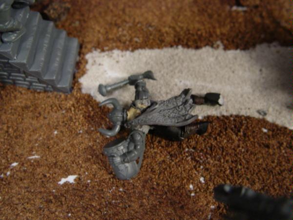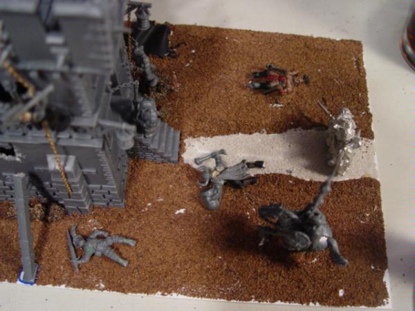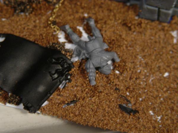 Just thought I'd throw some vignette-style ideas out there, as I feel like narrative and dynamism are what really set the great dioramas apart from the merely well-built/-painted. If that's not a direction you want to take, then I'll just throw my lot in with the "moar corpses" crowd. It's looking good so far, but some additional carnage would bump it from "scheduled demolition by crew with crappy haircuts" to "siege by a badass warband" territory.
