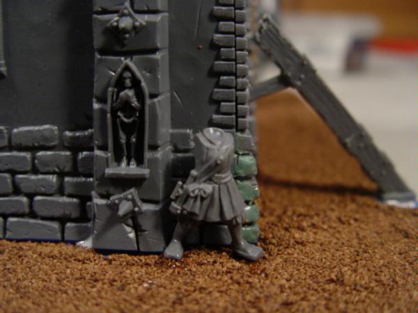 If you're able (and from the rest of the post, I think you should be) I think your work is beggng for a slumped empire soldier leaning against the side of the watchtower, head lolling, with a big mean crossbow bolt sticking out of his stomach.