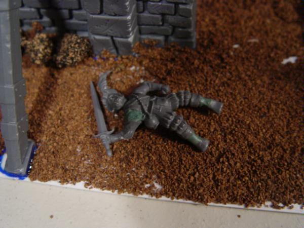 So thanks everyone for the ideas, odviously went on added the corpses as I said I would! And I finally got around to putting the guy on the other side half way up the wall... @oadie, your idea for the lone pistoleer, was actually exatctly what I was trying to describe, you merely said it clearer and better than I! While I don't think I will put marauders right around the corner, hes definitely going to come off as a fighter! Although as you will see in the new picks, for the lawl, I decided to put the arm/head of the guy covering his ears (not glued on just resting there) and now Im having trouble deciding what to do! The fighty pistol guy, or the empire baby thats too afraid to fight! Thoughts? Let me know what you think of the piece now as a whole! Its got alot of little details that add to it, but it also gets the point across that Wulfric and his force are bearing down on empire forces! Edit: Also mind you none of the corpses are glued down yet so if you have any thoughts on better placement, please do let me know! "ALMOST THERE!" Dead....Dead....Dead.... Ooo hes ali....dead... Somebody isnt too good at defending the west wall! There wont be any more drumming from this fella! At least he has a raised area to rest on! Oh wait hes dead too... Alternate guy in the back... Afraid empire soldier or fighty empire soldier?