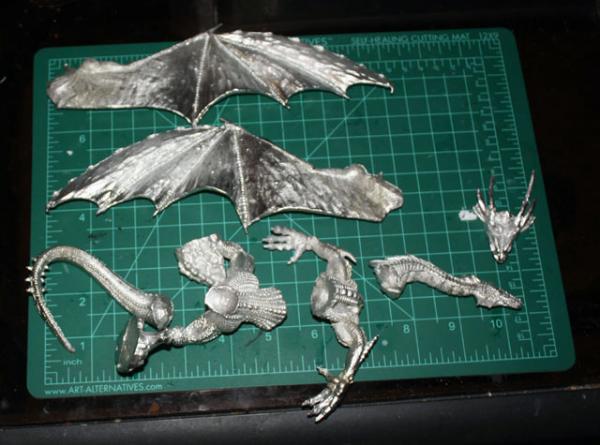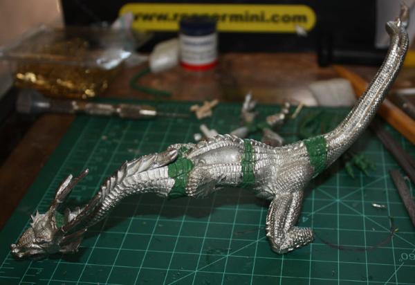 I'm going to convert the standing dragon into a flying pose, adding full rope-and-chain rigging using parts intended for model ships. Small-scale Napoleonic infantry minis will provide a crew, and finally mount it all on a pole so that it appears to be flying over an ocean. My goal is for the mounting pole to be hidden behind one of the wings as it makes a banking turn, and for the base to have a small ship (from one of the smaller scales) on it to provide altitude perspective.