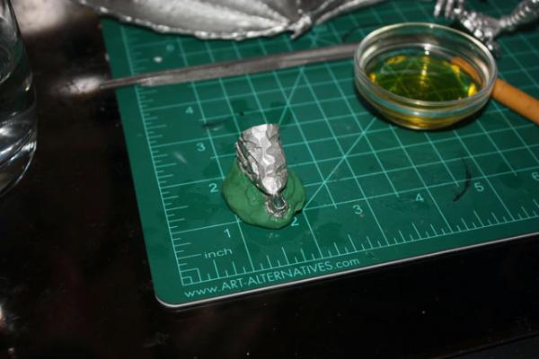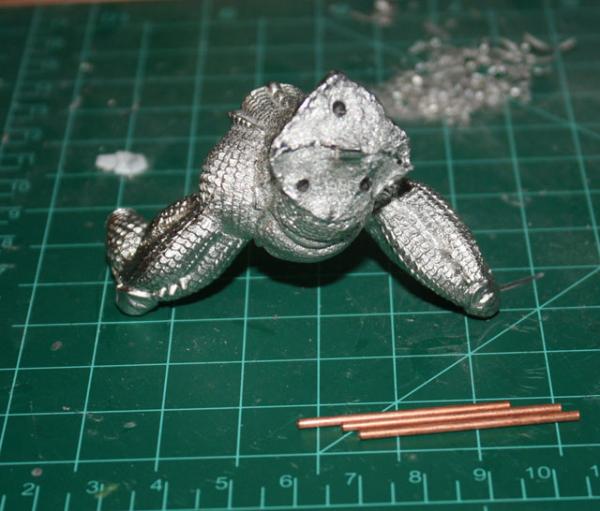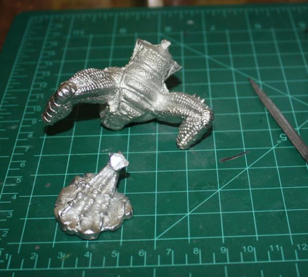 My first cut with the dremel tool, ever, was simply to cut off the other back foot. (You can also see my first dremel-based accident: a cut-burn-mark in the cutting pad.)