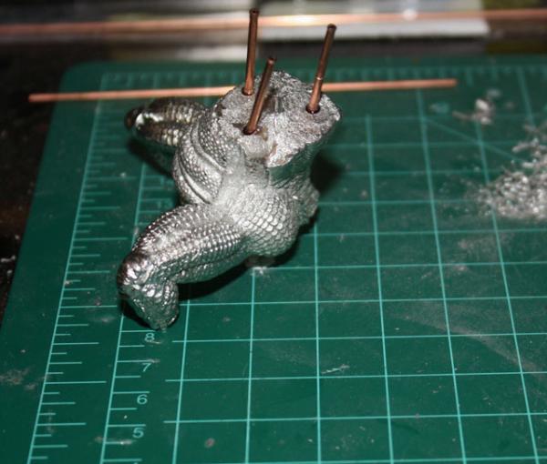 The lower body got THREE pinning holes, drilled large enough for copper rod instead of my usual paper clip pins. Needless to say, this thing is going to have some serious weight being supported across the body, and it will be horizontal instead of vertical as the model is designed. Hopefully this will support the rear-end of the model properly (since the only contact point with the base will be a giant rod through the upper body and maybe a screwed-on bracket).