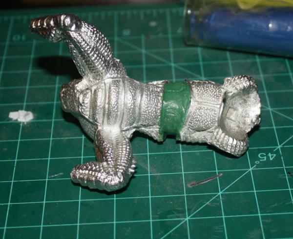 Finally, green stuff got stuck in between the pins, matching holes were drilled in the upper body, and the two major chunks of body are now fused to one. Tomorrow, after the under-layer of putty has time to cure, I'll be sculpting another layer of Green Stuff to match the rest of the body.