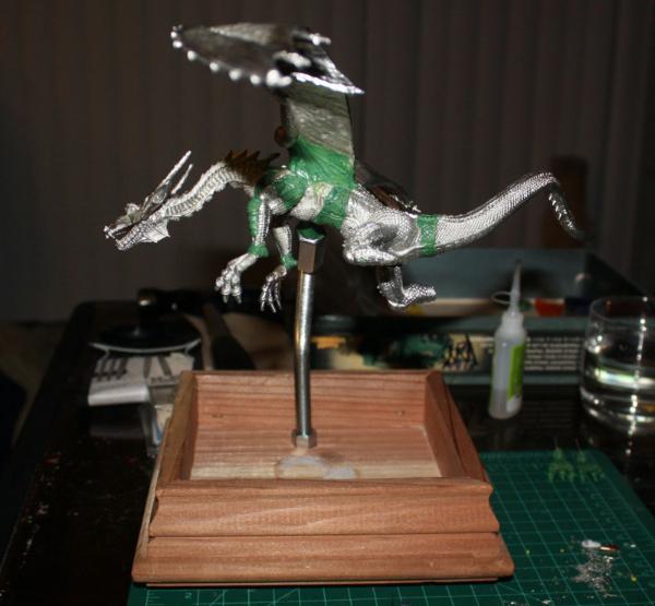 This isn't a permanent mounting, as neither end has been glued/green stuff'd. I've got a coupling bolt in the base, another one GS'd to a screw driven into the side of the dragon. Next step will be mounting the wings, and then it's to putting on the crew!