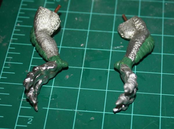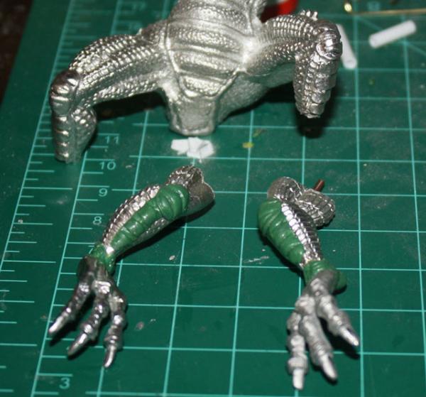 The dragons in the Temeraire-a-verse don't have the anthropomorphic upper arms that this model does; they're more strictly quadrupeds with wings. On top of that, the "RAWR" pose just doesn't work for an in-flight positioning. So, the arms had to be chopped off. When the time comes, I will be putting them back on backwards, to make them look more like legs than arms. Cast-and-sculpted feet (as mentioned above) will be used to replace the claws.