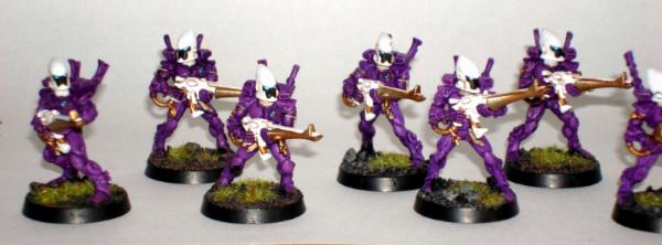 Well this has been a while since I updated! @poipo32 and ddigre01: Thanks for the positive responses! But poipo32, the big head stays :/ Unfortunately I failed the challenge, though fortunately I didn't completely bomb out - since I also managed to get my Dire Avengers painted! I tried to give them a slightly more opulant look than usual, and added Purple into the Head Dress as a nod to the primary Craftworld colours. A full squad of 10, in action poses. ...and here's my dual-Shurikan weilding Exarch. It's strange, I don't often see people with their Exarches firing both weapons in the same direction...