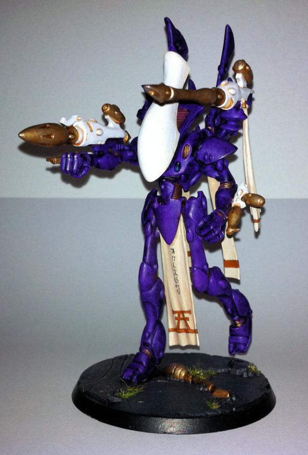And without further ado, here is my finished Wraithlord! I wasn't too happy with the poses that I were able to get him in, so some cutting, pinning and greenstuff later, I've hopefully got him in a more dynamic pose. I've decked him in the craftworld colours, so he essentially looks like a 'super' Guardian - complete with matching Spirit Stone. (Sorry, not having much luck shrinking this forum image!)