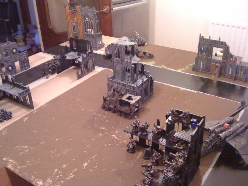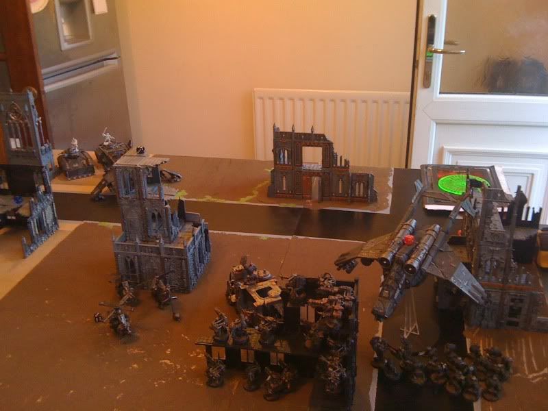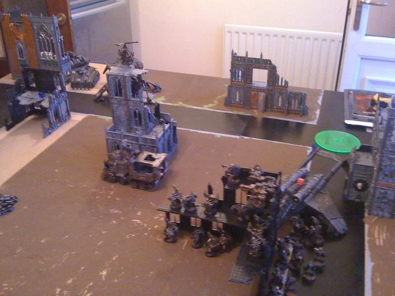As I guess Craig fed me suicide meltas which have done the job and popped my tank but he's lost them in the process and had his Valkyrie immoblised which is asking for trouble next turn. With those Orks now on foot they can move to the objective where the Lootas are while the Battlewagon uses the tower as cover to claim the other as it's on the first floor and within 3"
