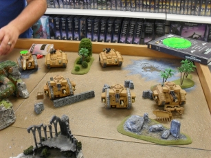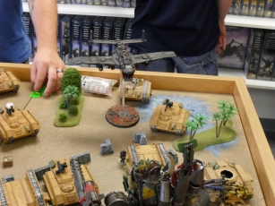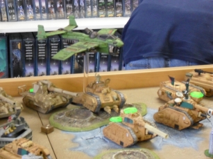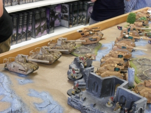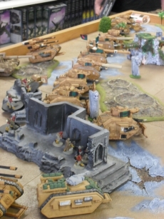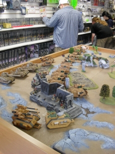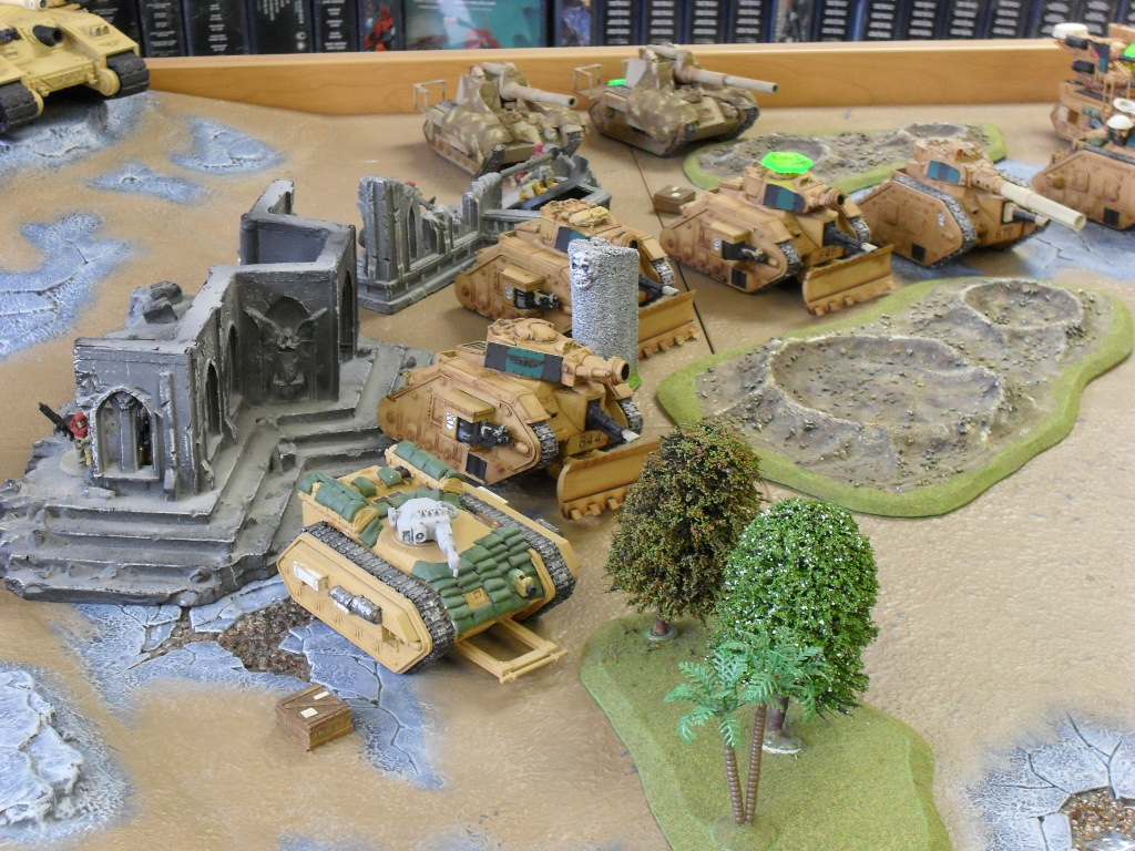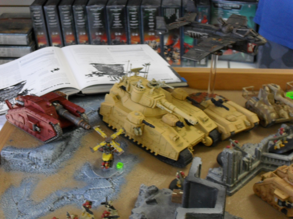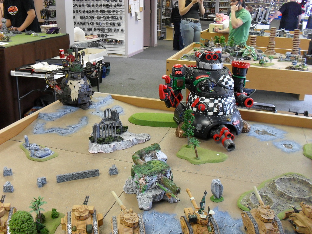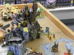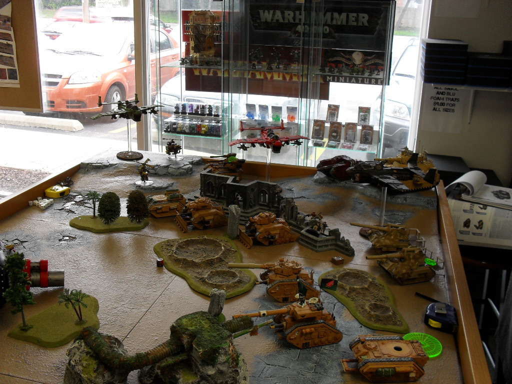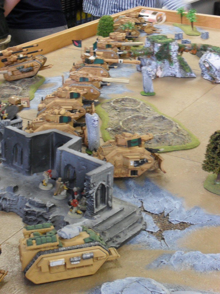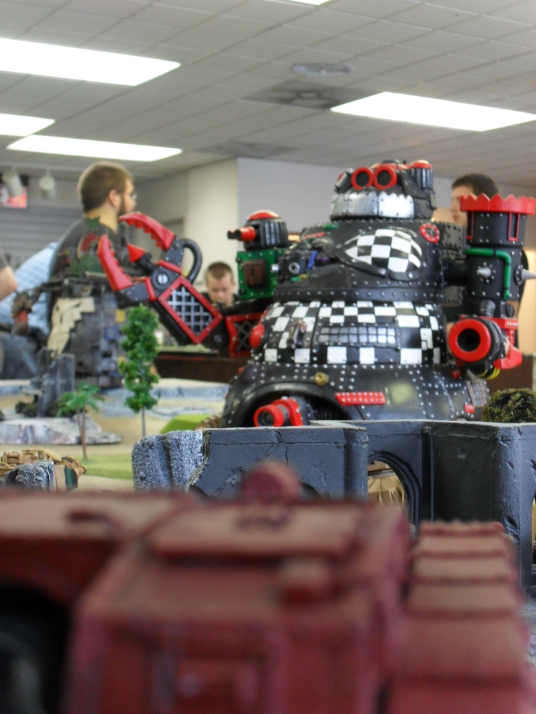 So we arrived at noon on the 31st to find the larger tables already occupied, so we’d be cramming onto a small board with our 6000 points each. I also discovered that Longshot had gone an entirely different direction than I anticipated with his army list. It was an all Imperial Guard mechanized / armored force with no titans or flyers. He did have 3 superheavy tanks though, including a cool Valdor Tank Hunter that I was looking forward to seeing in action.