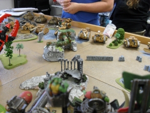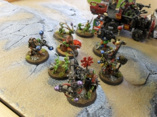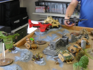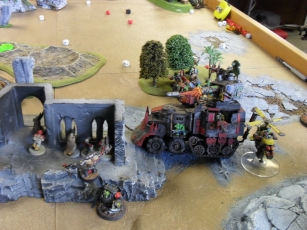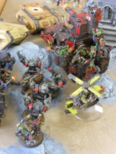 A boyz mob from one of the battlewagons unloads behind their wagon to prepare to charge the demolisher squadron next turn.