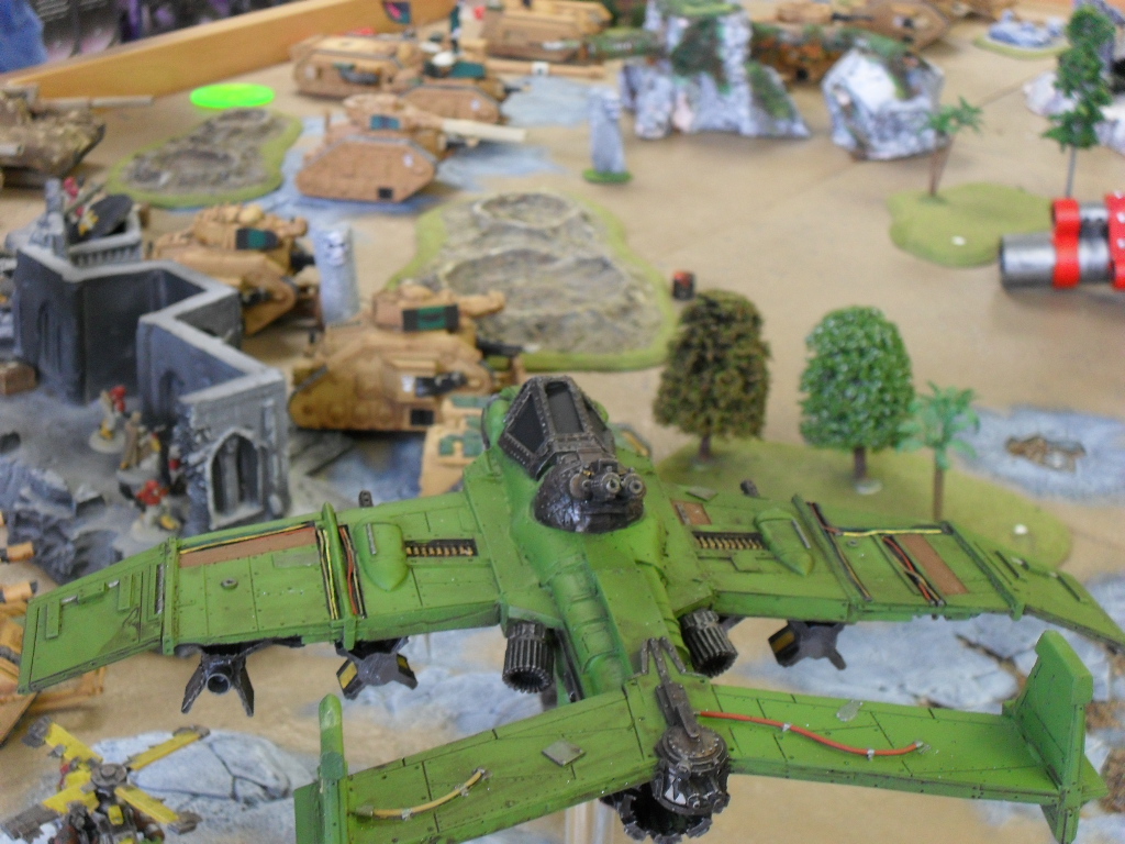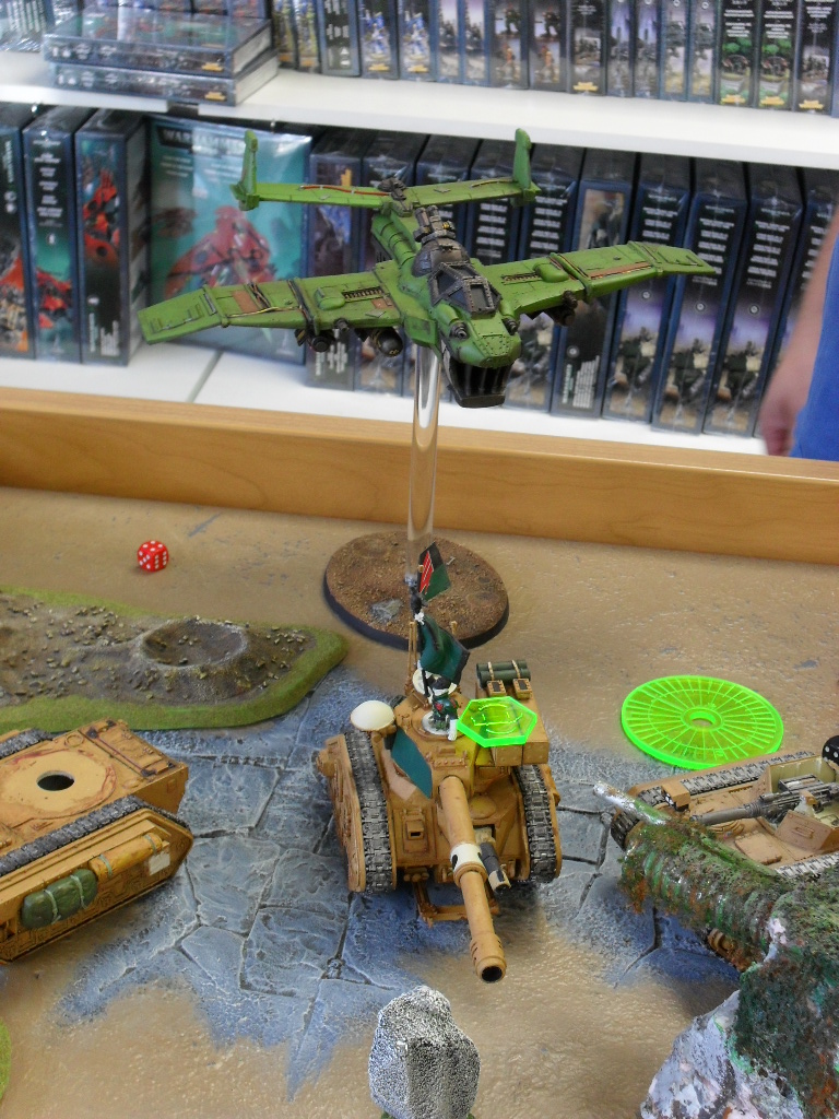Then the rest of his force opens up on Gorkzilla. 4 Lascannon, 3 earthshaker, 3 double vanquisher shots, and 3 double demolisher shots later and his fields are stripped, the lifta droppa is destroyed, and his drive is damaged.