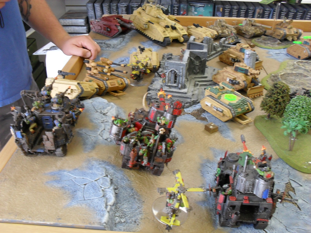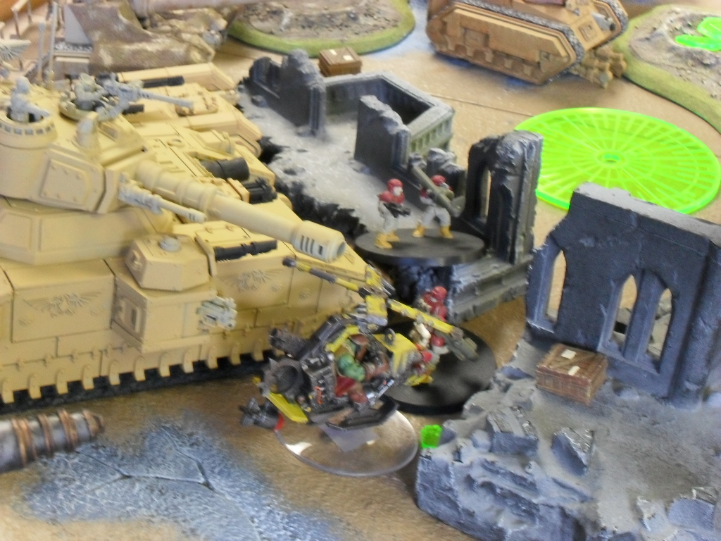 Victory Points: a quick tally of remaing points on the table shows the Imperial Guard with roughly 1000 points more than the depleted orks. Notably the Imperials have three relatively undamaged super-heavy tanks and the orks have little left to counter them.