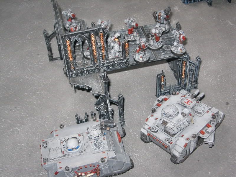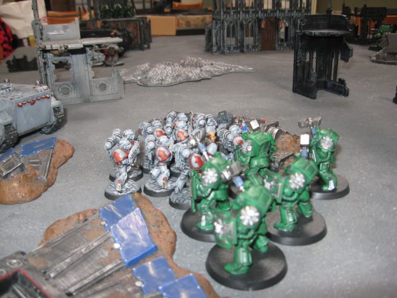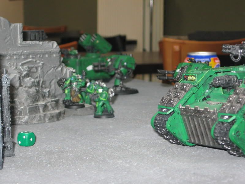 The Emissaries blow up a advancing razorback and kill all the marines inside. The predator blows up the whirlwind. In assault the termies immobilise and weapon destroy the landraider.