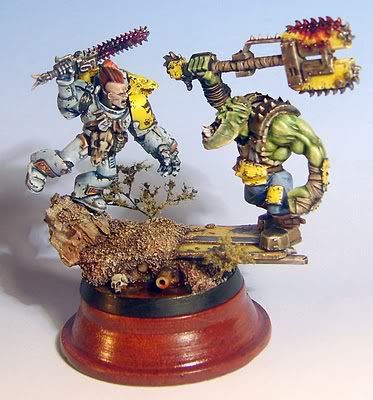 You are clearly talented in the painting department, extremely talented. And because I'm being picky because of your high standard, there are two things that don't seem right to me. 1. The odd colour choices, for example the Empire captain, the pink sash and the turquoise shield bit do not go, they are too garish, especially along with the checks. (Kudos too you for being able to do checks) Think more about colour and colour theory, where do you want viewers to be drawn to on a model, try too use lighter colours on the face, weapon Etc. to achieve this. 2. Think more about the modelling side of things, the diorama at the top of the page, the Space Wolf is quite well positoned and posed, yet he is armed with two CCW, fair egnough, he is a SW but personally it doesn't click with me. I always expect to see a marine with a bolt weapon, clip empty or otherwise. The ork however is worse, the legs are quite static, which is odd with the mentality of an Ork, Waagghhh and all that, he should be running. The Orks clenched fist also looks a bit unatural to me. As if the Ork is tensing to recieve a hit, very Un-Orky.