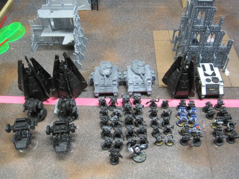 The Primed marines had another epic battle, well, about a month ago now. You'll have to forgive me if I don't remember the details so well anymore. But it has pictures! Hopefully useful ones, but that's up to the community. Also, due to self-fail, I don't have pictures for every turn... but I have a few different angles on the same turn. Not perfect. Anyway, here's the lists!