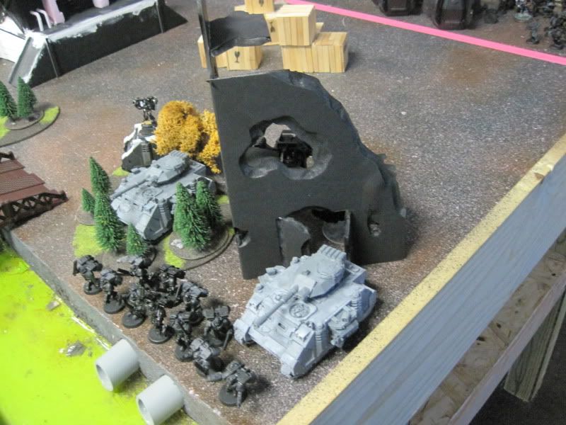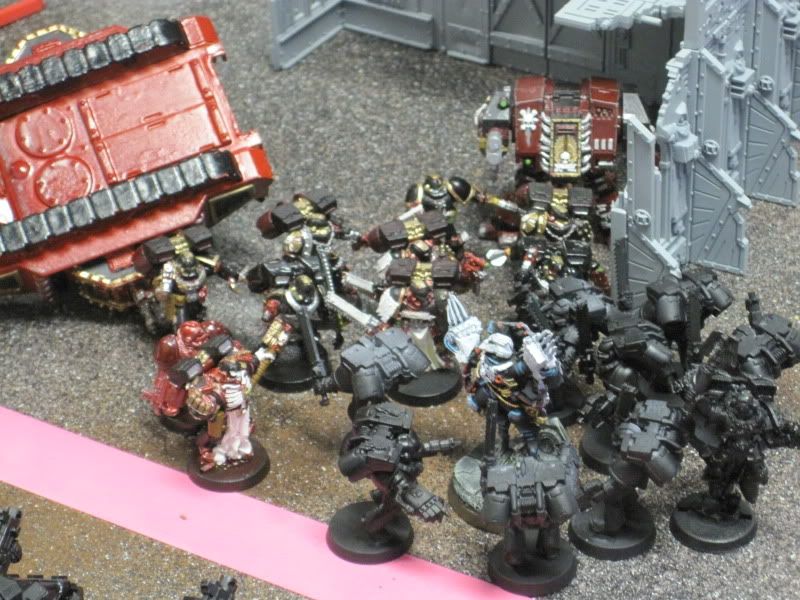A Blood Angels Baal Pred comes in straight outta reserves on his right flank, as does his Terminator squad by his sniper scouts. His Death Company roll to come in but mishap off the board and are delayed. He shuffles around a bit, then proceeds to Multimelta my multimelta Dreadnought (explodes, the first of many craters in his deployment zone), and charge into assault with my Tactical squad who gets splatted over the course of the next two turns (unfortunately passing a leadership test instead of running then being able to shoot.)