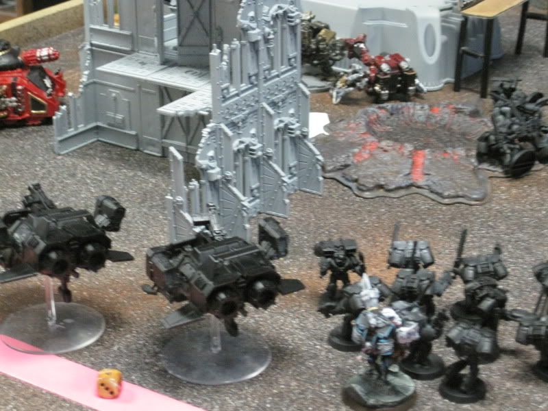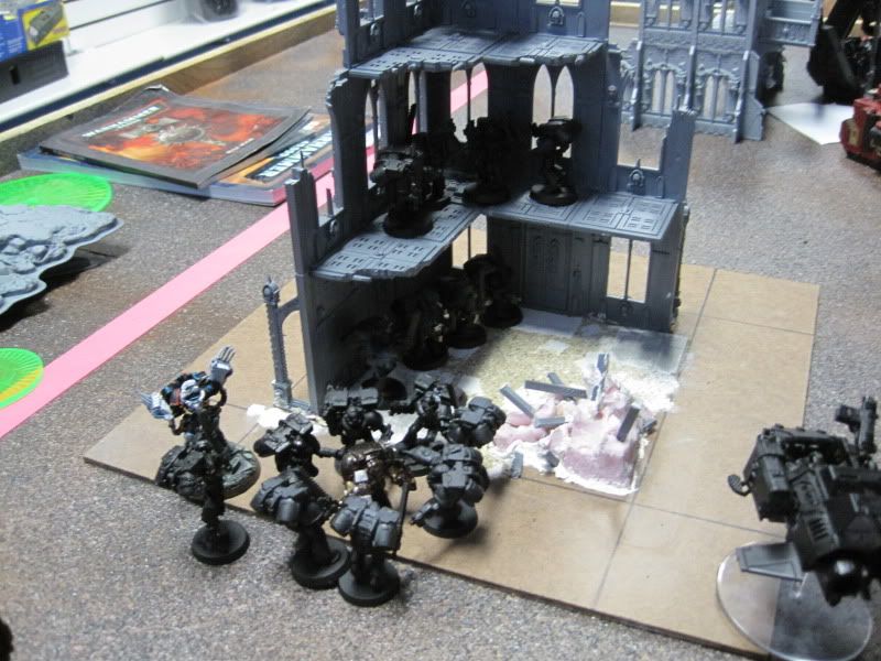 RG: Shrike and the Plasma Dreadnought come in, outflanking and dropping right by his scouts and Terminators. Only shooting of note comes from Speeders, who immobilize and stun his Predator (poor guy didn't get a shot all game.) Some minor shooting chips away at Terminators before a multiassault by two assault squads, a Librarian, and Shrike splatter his scout squad against a wall and knock his terminators down to 1 man at the cost of 5 Jumpers from one squad.
